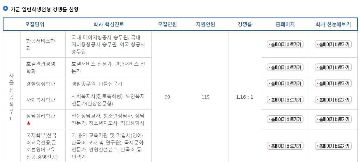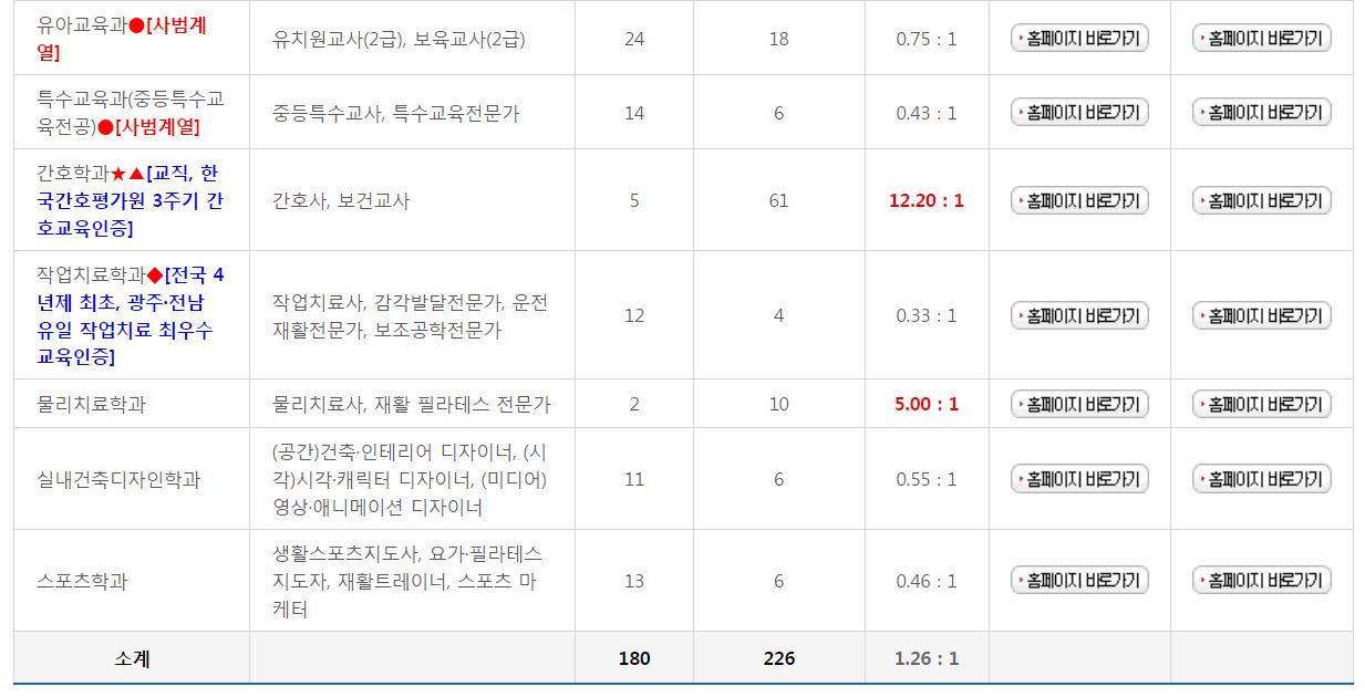 가군 일반학생전형의 유아교육과, 특수교육과(중등특수교육전공), 작업치료학과, 실내건축디자인학과, 스포츠학과는 미달이었으며, 이외의 학과 중 가장 경쟁률이 높았던 학과는 간호학과(12.20:1), 물리치료학과(5.00:1), 자율전공학부1 (1.16:1) 순이었습니다.