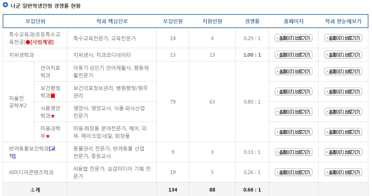 나군 일반학생전형의 특수교육과(초등특수교육전공), 자율전공학부2, 반려동물보건학과, AI미디어콘텐츠학과는 미달이었으며, 치위생학과는 모집인원과 지원인원이 같았습니다.