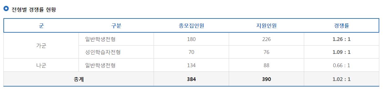 전형별 경쟁률을 보자면, 가군 일반학생전형의 경쟁률은 1.26:1 이었으며, 성인학습자전형의 경쟁률은 1.09:1 이었습니다. 나군 일반학생전형은 미달이었습니다.