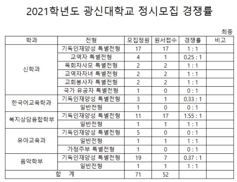 2021학년도에 광신대학교는 신학과(교역자 특별전형, 국가 유공자 특별전형), 한국어교육학과(기독인재양성 특별전형, 일반전형), 유아교육과(기독인재양성 특별전형, 가정주부 특별전형), 음악학부(기독인재 양성 특별전형)가 미달이었으며, 나머지 학과 중 가장 경쟁률이 높았던 학과는 복지상담융합학부(기독인재양성 특별전형)였습니다.
