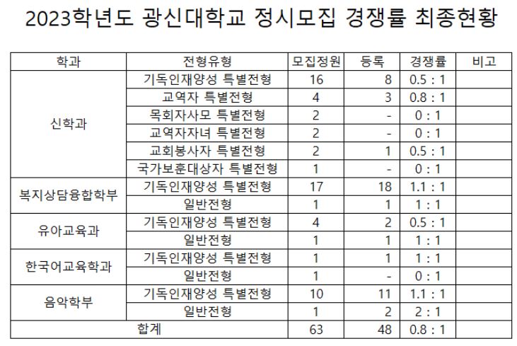2023학년도에 광신대학교는 복지상담융합학부(기독인재양성 특별전형, 일반전형), 유아교육과(일반전형), 한국어교육학과(기독인재양성 특별전형), 음악학부(기독인재양성 특별전형, 일반전형) 말고는 모두 미달이었습니다. 가장 경쟁률이 높았던 학과는 음악학부 일반전형 2:1 이었습니다.