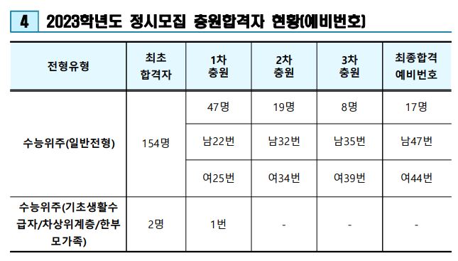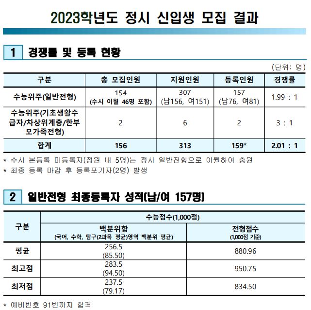 2023학년도 경쟁률을 보면 일반전형은 1.99:1이었으며, 이외 정원외 전형은 3:1이었습니다. 일반전형 최종등록자 성적 평균은 백분위합 256.5였습니다.