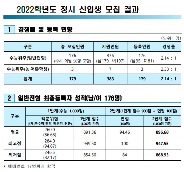 2022학년도 경쟁률을 보면 일반전형은 2.14:1이었으며, 이외 정원외 전형은 2.33:1이었습니다. 일반전형 최종등록자 성적 평균은 백분위합 260.0였습니다.
