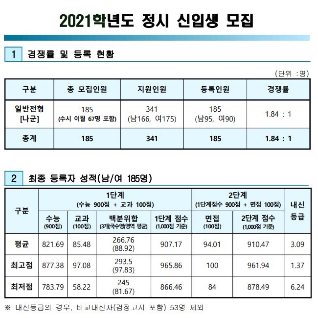 2021학년도 경쟁률을 보면 일반전형은 1.84:1이었으며, 일반전형 최종등록자 성적 평균은 백분위합 266.76 였습니다.