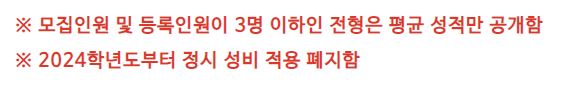 광주교육대학교는 모집인원 및 등록인원이 3명 이하인 전형은 평균 성적만 공개하며, 2024학년도부터 정시 성비 적용을 폐지했습니다.