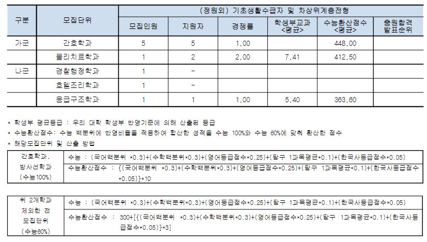 가군 : 유아교육과, 초등특수교육과, 향장미용학과, 식품영양학과, 간호학과, 물리치료학과, 스포츠레저학과, 물리치료학과(기초생활수급자 및 차상위계층), 간호학과(기초생활수급자 및 차상위계층)