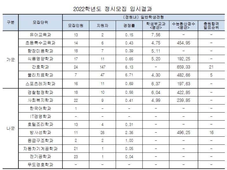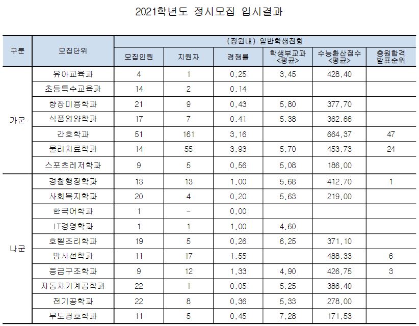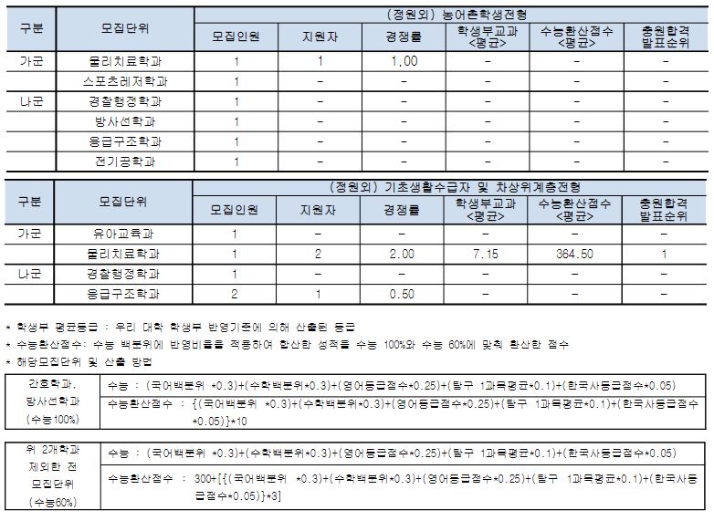 가군 : 유아교육과, 초등특수교육과, 향장미용학과, 식품영양학과, 간호학과, 물리치료학과, 스포츠레저학과, 물리치료학과(농어촌), 스포츠레저학과(농어촌), 유아교육과(기초생활수급자 및 차상위계층), 물리치료학과(기초생활수급자 및 차상위계층)
