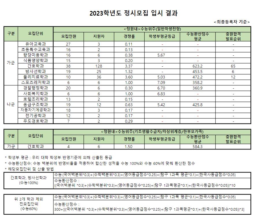 | [4년제/광주광역시] 2024학년도 정시 대비 광주대학교 3개년 정시 등급 (2021~2023년) (0) | 2023.12.26 |