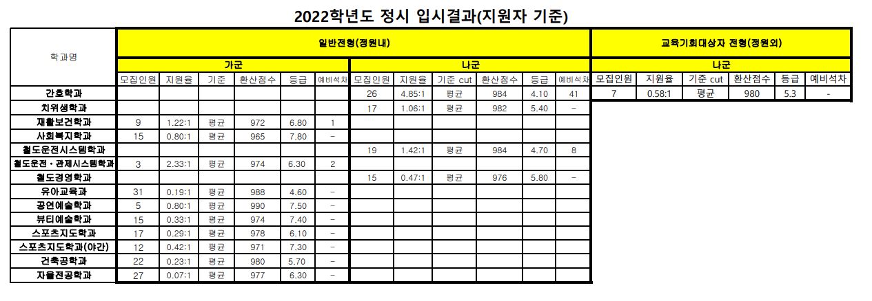 가군 : 재활보건학과, 사회복지학과, 철도운전시스템학과, 철도운전관제시스템학과, 철도차량전기시스템학과, 철도운전경영학과, 경찰행정학과, 유아교육과, 한국어교육과, 공연예술학과, 미용예술학과, 스포츠지도학과(주간), 스포츠지도학과(야간), 건축공학과, 자율전공학과, 사회서비스융합학과