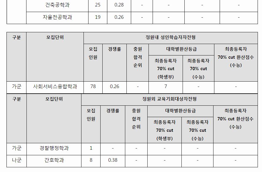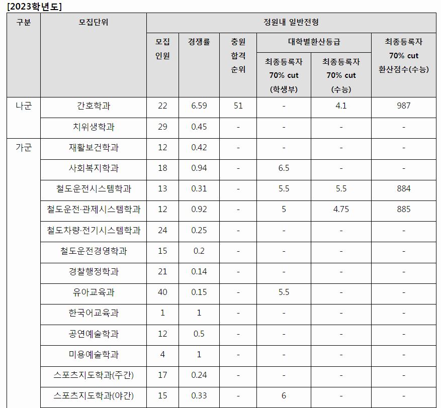 이 중 치위생학과, 재활보건학과, 사회복지학과, 철도운전시스템학과, 철도운전관제시스템학과, 철도차량전기시스템학과, 철도운전경영학과, 경찰행정학과, 유아교육과, 공연예술학과, 스포츠지도학과(주간), 스포츠지도학과(야간), 건축공학과, 자율전공학과, 사회서비스융합학과(성인학습자), 간호학과(교육기회대상자)는 미달이었으며, 이외의 학과 중 가장 경쟁률이 높았던 학과는 간호학과(6.591) 이었습니다.