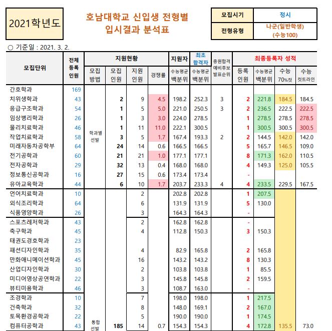2021학년도 호남대학교의 미래자동차공학부, 전자공학과, 정보통신공학과, 통합선발은 미달이었으며, 이외의 학과 중 가장 경쟁률이 높았던 학과는 물리치료학과(11.0:1), 응급구조학과(5.0:1), 치위생학과(4.5:1) 순이었습니다.