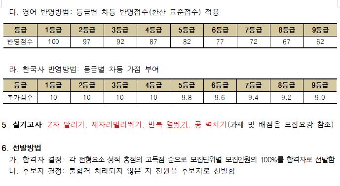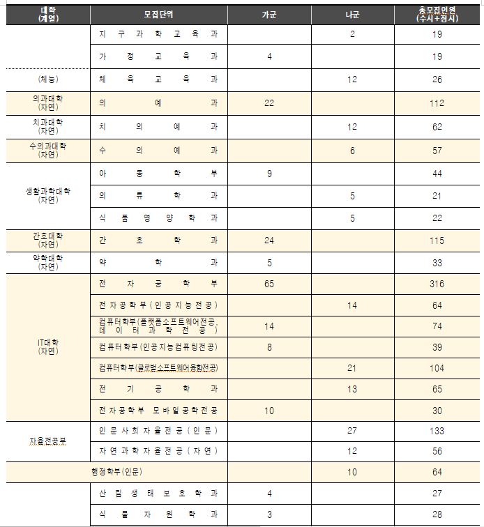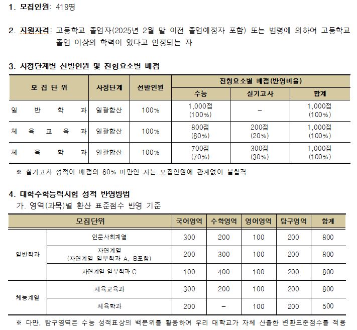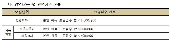 나군에서 일반학과는 수능 100%로, 체육교육과는 수능 80% + 실기 20%로, 체육학과는 수능 70%와 실기 30%로 학생을 선발합니다. 체육교육과는 수학을 반영하지만 체육학과는 반영하지 않으며, 실기고사는 Z자 달리기, 제자리멀리뛰기, 반복 옆뛰기, 공 벽치기를 시행합니다.