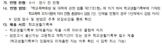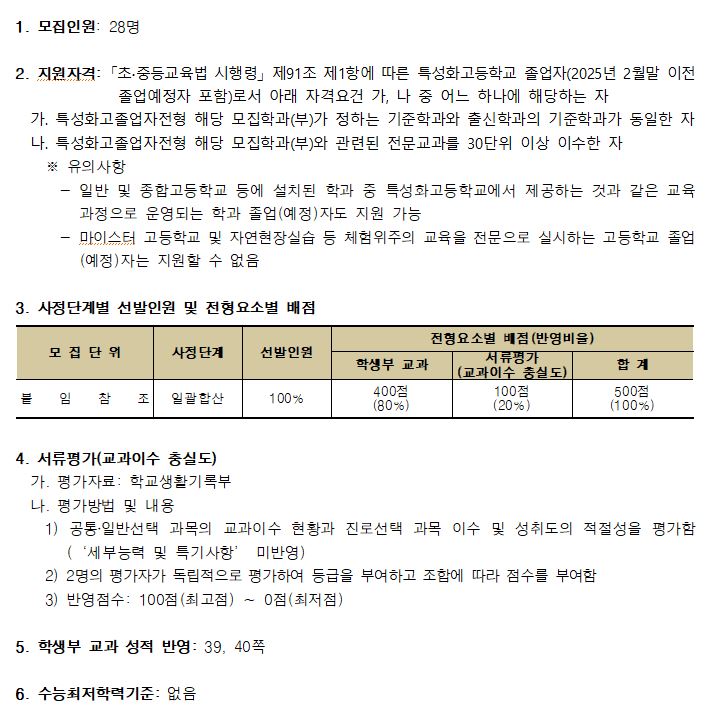 특성화고졸업자전형 역시 교과 80% + 서류평가 (교과이수 충실도)를 20% 반영합니다.
