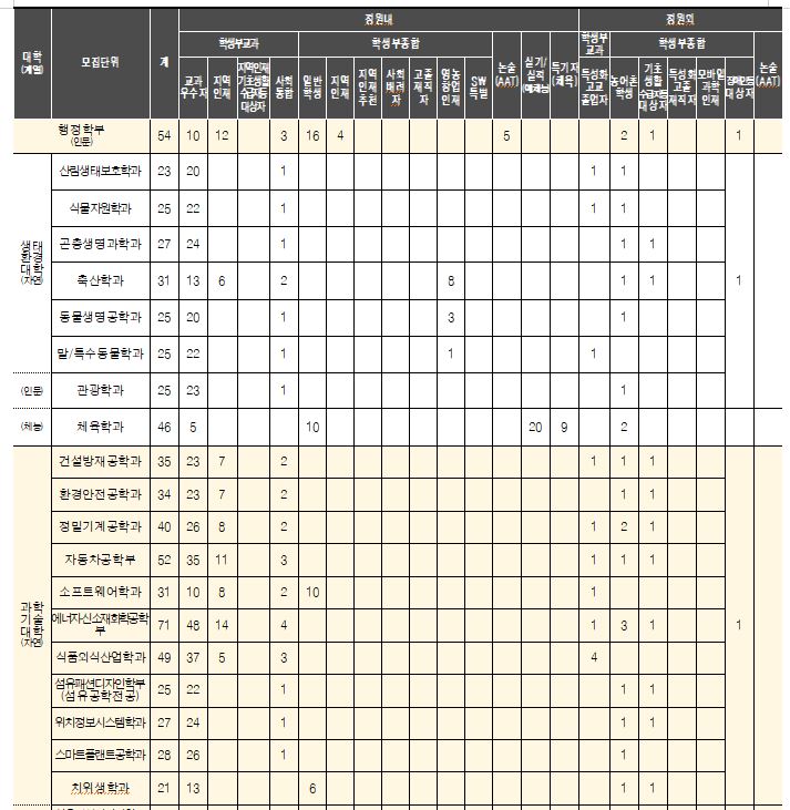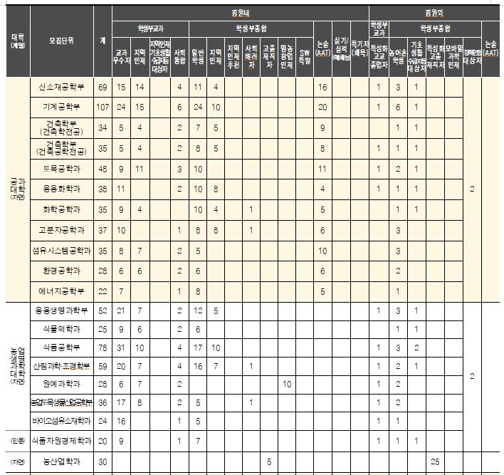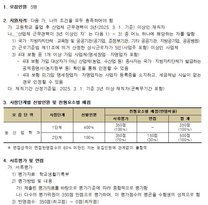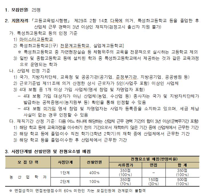 해당 전형으로는 농산업학과의 신입생을 모집하며, 1단계에서 4배수의 학생을, 2단계에서 서류평가 70% + 면접 30%를 합산하여 학생을 선발합니다.
