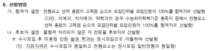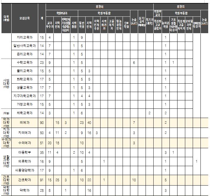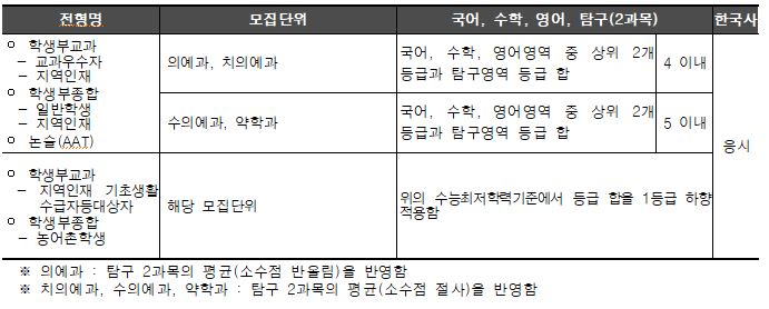 해당 전형으로는 의예과, 치의예과, 간호학과, 약학과의 신입생을 모집합니다. 전형 방법은 동일합니다.