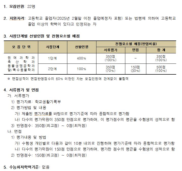 해당 전형으로는 원예과학과, 축산학과, 동물생명공학과, 말/특수동물공학과의 신입생을 모집합니다. 1단계에서는 4배수의 학생을 선발한 뒤, 2단계에서 서류평가 70%와 면접 30%를 합산하여 학생을 선발합니다.