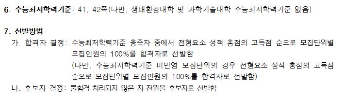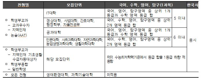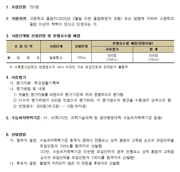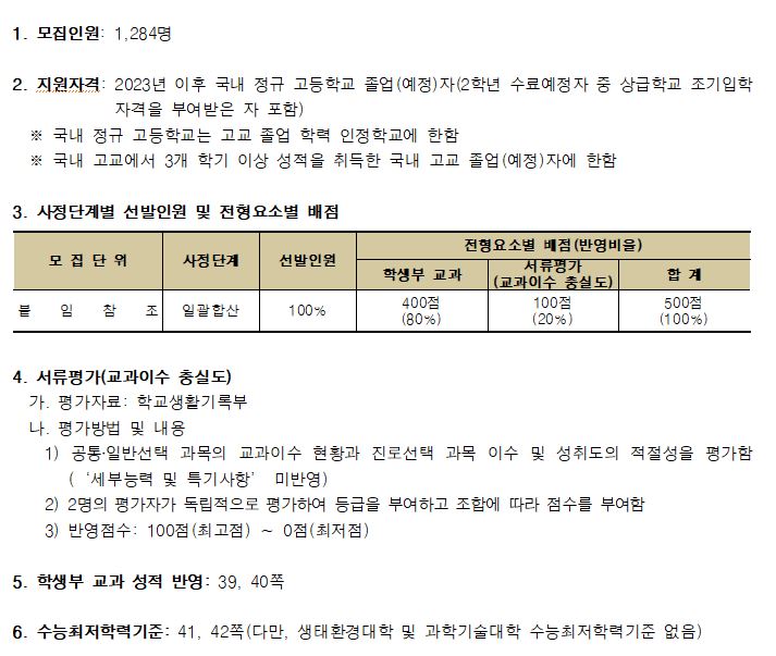 여기서부터는 학생부종합 일반학생 전형입니다. 서류평가만 100% 시행하며, 면접을 따로 진행하지 않습니다. 수능최저학력기준이 있으나 과학기술대학과 생태환경대학은 없습니다.