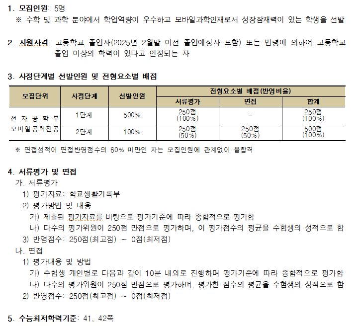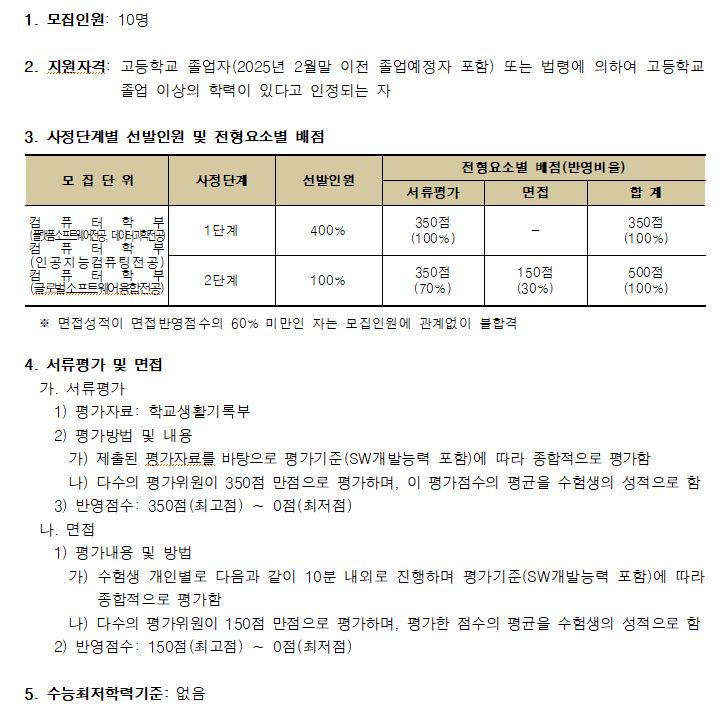 해당 전형에서는 컴퓨터학부의 신입생을 모집하며, 1단계에서 4배수의 학생을 선발한 뒤, 2단계에서 서류 70% + 면접 30%를 합산하여 학생을 선발합니다. 수능최저학력기준은 없습니다.