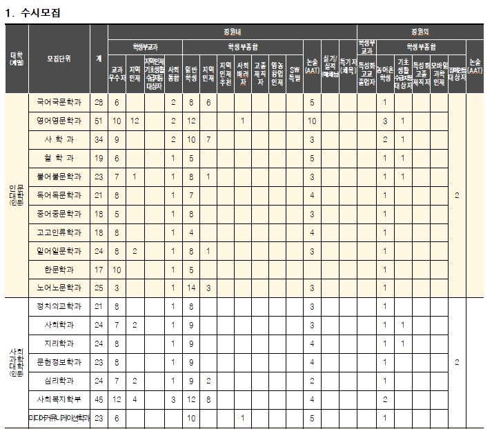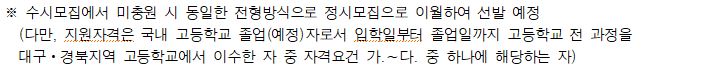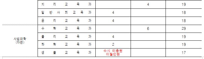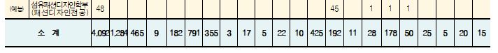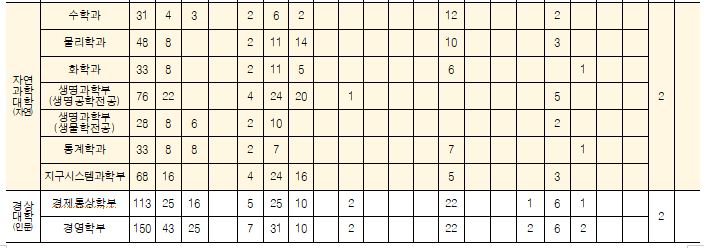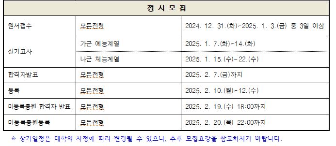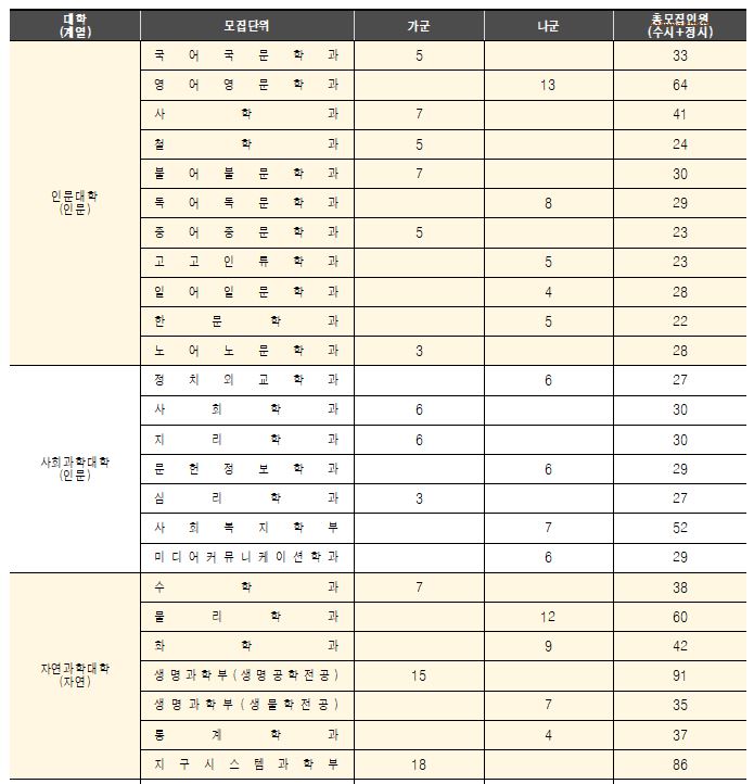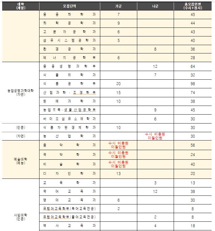정시모집에서 식품자원경제학과, 음악학과, 국악학과, 미술학과, 생물교육과, 섬유패션디자인학부(패션디자인전공)은 따로 정시로 학생을 모집하지 않으며, 수시 미충원 이월인원을 모집할 예정입니다.