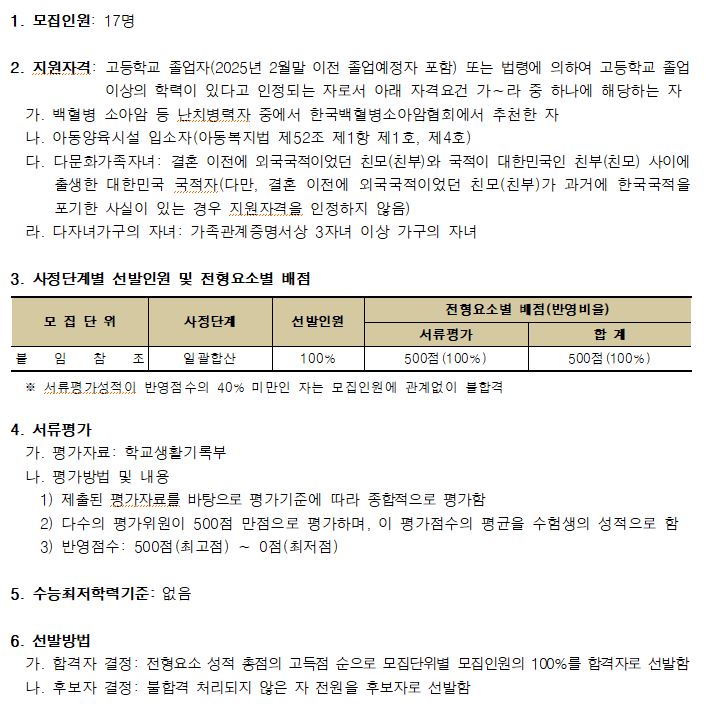 해당 전형으로는 난치병력자 중 한국백혈병소아암협회에서 추천한 자, 아동양육시설 입소자, 다문화가족자녀, 다자녀가구의 자녀 중 학생을 선발합니다. 서류평가만 진행하여 학생을 선발하고, 수능최저학력기준은 따로 없습니다.