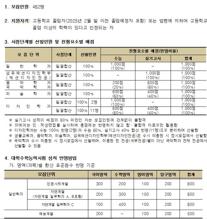 일반학과는 수능 100%로 학생을 선발하고, 섬유패션디자인학부 패션디자인전공은 실기 100%, 음악학과와 국악학과는 수능 20% + 실기고사 80%, 미술학과는 수능 60% + 실기 40%, 디자인학과는 수능 100%로 2명, 수능 60% + 실기 40%로 11명을 선발합니다.