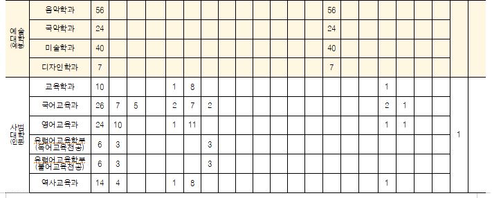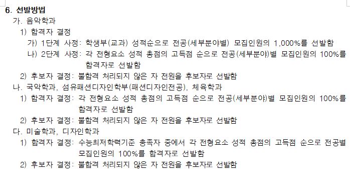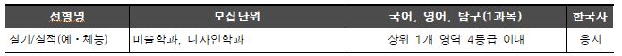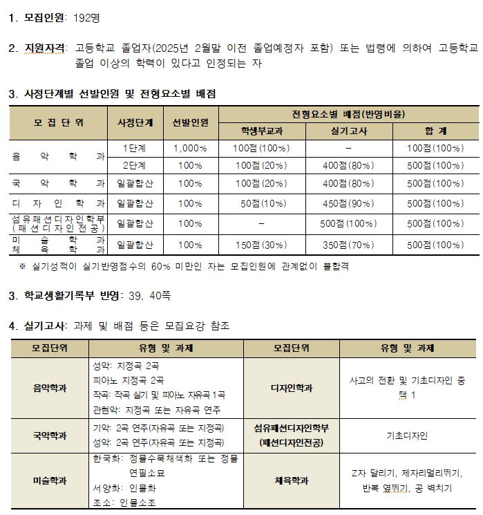 해당 전형으로는 음악학과, 국악학과, 디자인학과, 섬유패션디자인학부(패션디자인전공), 미술학과/체육학과의 신입생을 모집하며, 음악학과는 1단계에서 교과 100%로 10배수를 선발한 뒤, 2단계에서 교과 20% + 실기 80%를 합산하여 학생을 선발합니다.