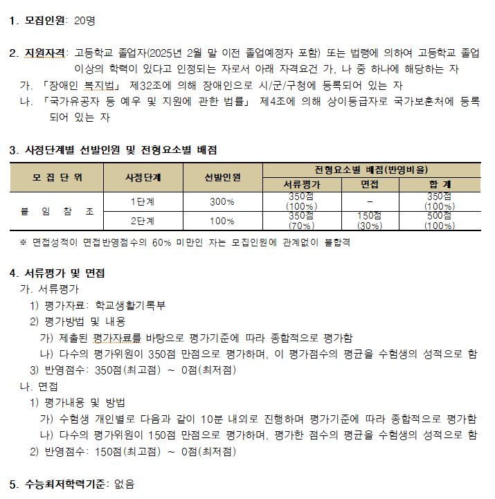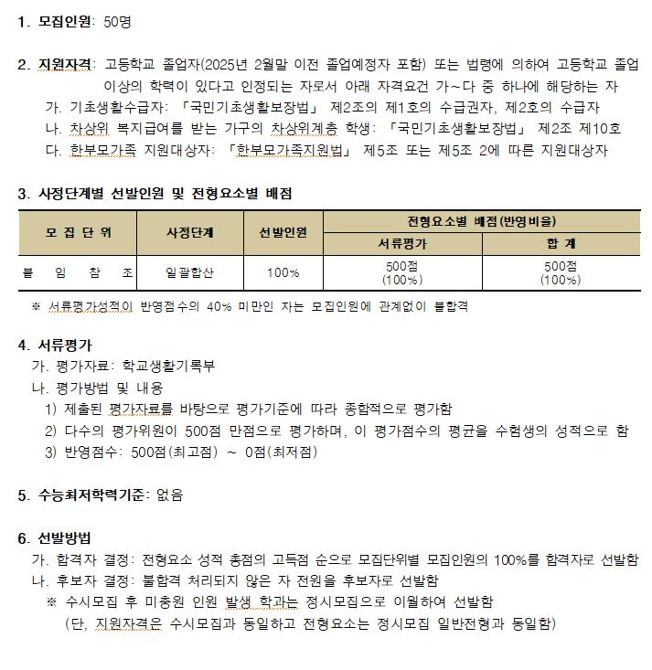 기초생활수급자대상자전형은 수능최저학력기준이 없으며, 서류 100%로 학생을 선발합니다.