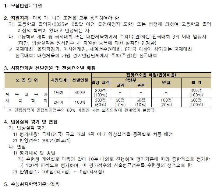 특기자(체육)전형으로는 체육교육과, 체육학과의 신입생을 모집하며, 1단계에서는 입상실적 100%로 4배수를 선발하고, 2단계에서 입상 실적 60% + 교과 10% + 출결 10% + 면접 20%를 반영하여 학생을 선발합니다.
