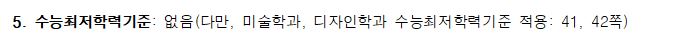 과제는 위에서 확인 가능하며, 미술학과와 디자인학과를 제외하고는 수능최저학력기준이 없습니다.