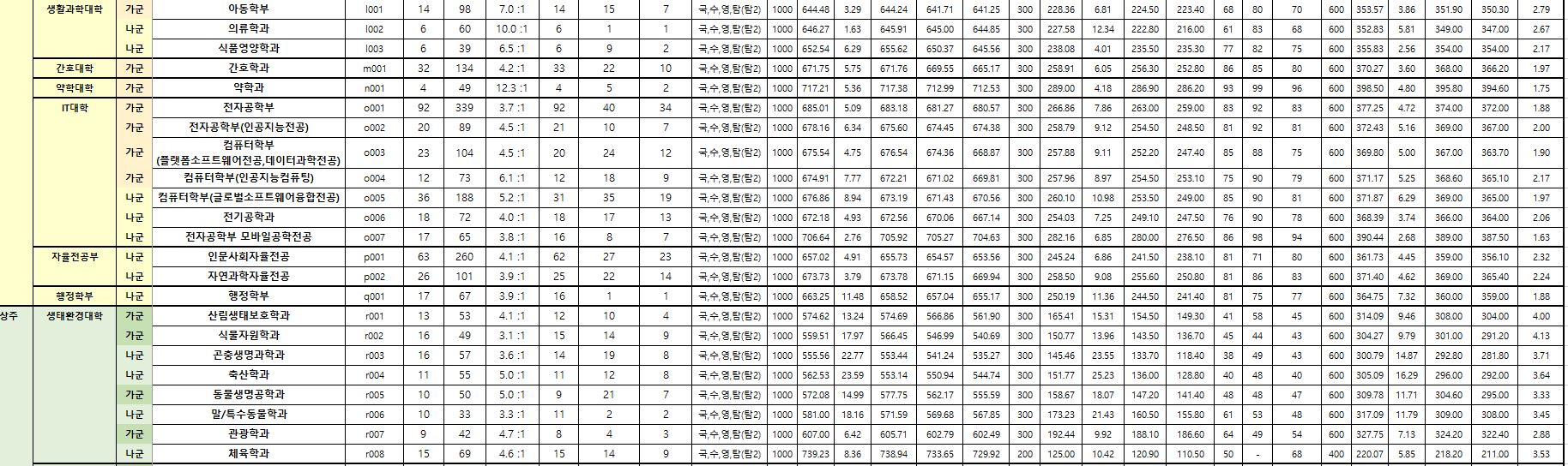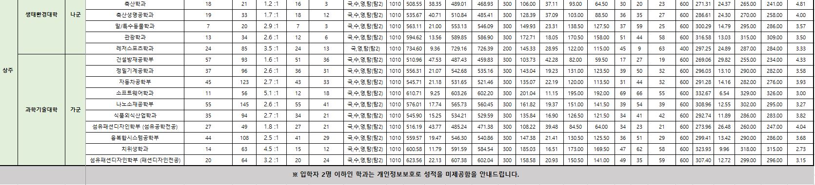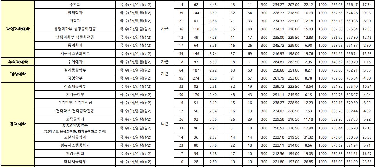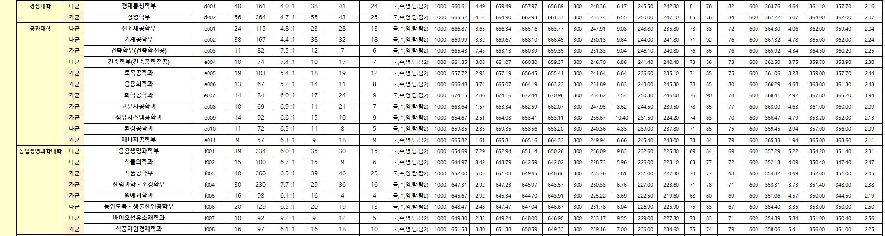 가군 : 국어국문학과, 사학과, 철학과, 불어불문학과, 중어중문학과, 노어노문학과, 사회학과, 지리학과, 심리학과, 수학과, 생명과학부(생명공학전공), 지구시스템과학부, 경영학부, 건축학부(건축학전공), 토목공학과, 응용화학과, 화학공학과, 고분자공학과, 섬유시스템공학과, 에너지공학부, 식품공학부, 산림과학조경학부, 원예과학과, 식품자원경제학과, 음악학과, 국악학과, 미술학과, 디자인학과, 영어교육과, 유럽어교육학부_독어교육학과, 일반사회교육과, 윤리교육과, 물리교육과, 화학교육과, 가정교육과, 의예과, 아동학부, 간호학과, 약학과, 전자공학부, 전자공학부(인공지능전공), 컴퓨터학부(플랫폼소프트웨어전공, 데이터과학전공), 컴퓨터학부(인공지능컴퓨팅), 산림생태보호학과, 식물자원학과, 동물생명공학과, 관광학과, 건설방재공학과, 환경안전공학과, 정밀기계공학과, 소프트웨어학과(상주), 식품외식산업학과, 섬유패션디자인학부(섬유공학전공), 치위생학과, 섬유패션디자인학부(패션디자인전공)