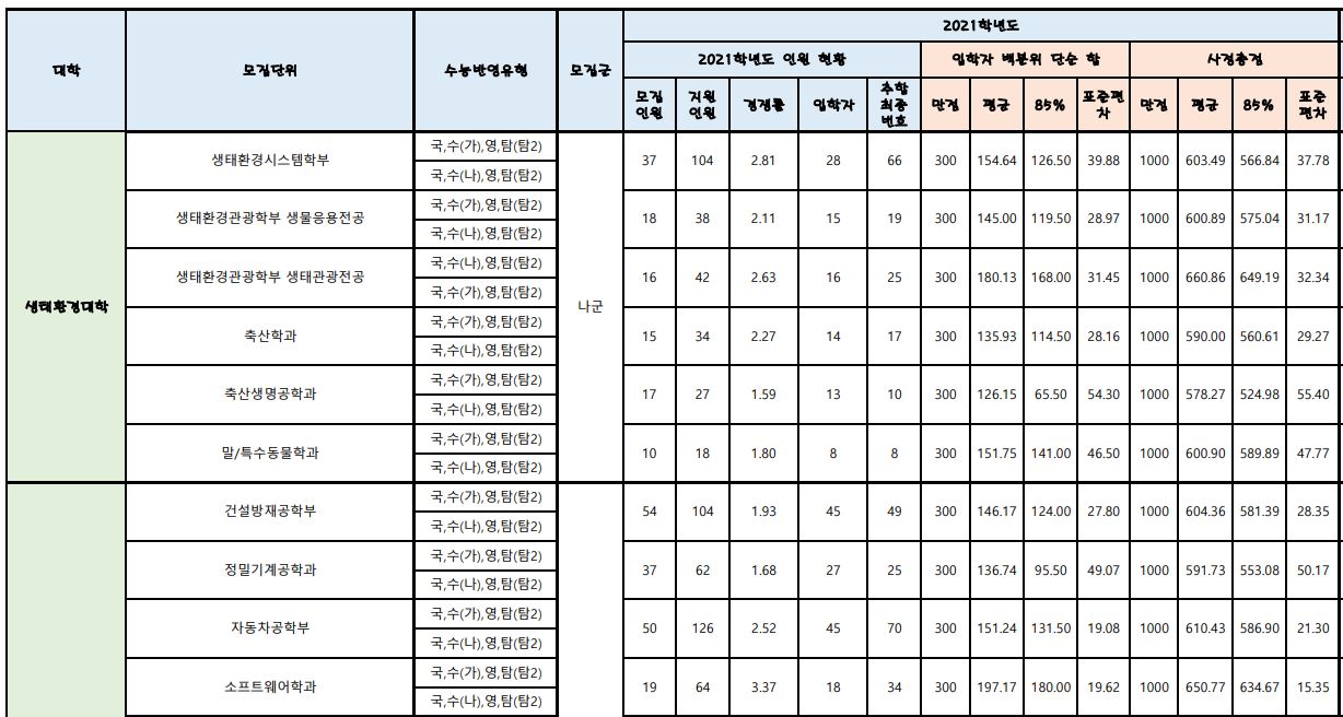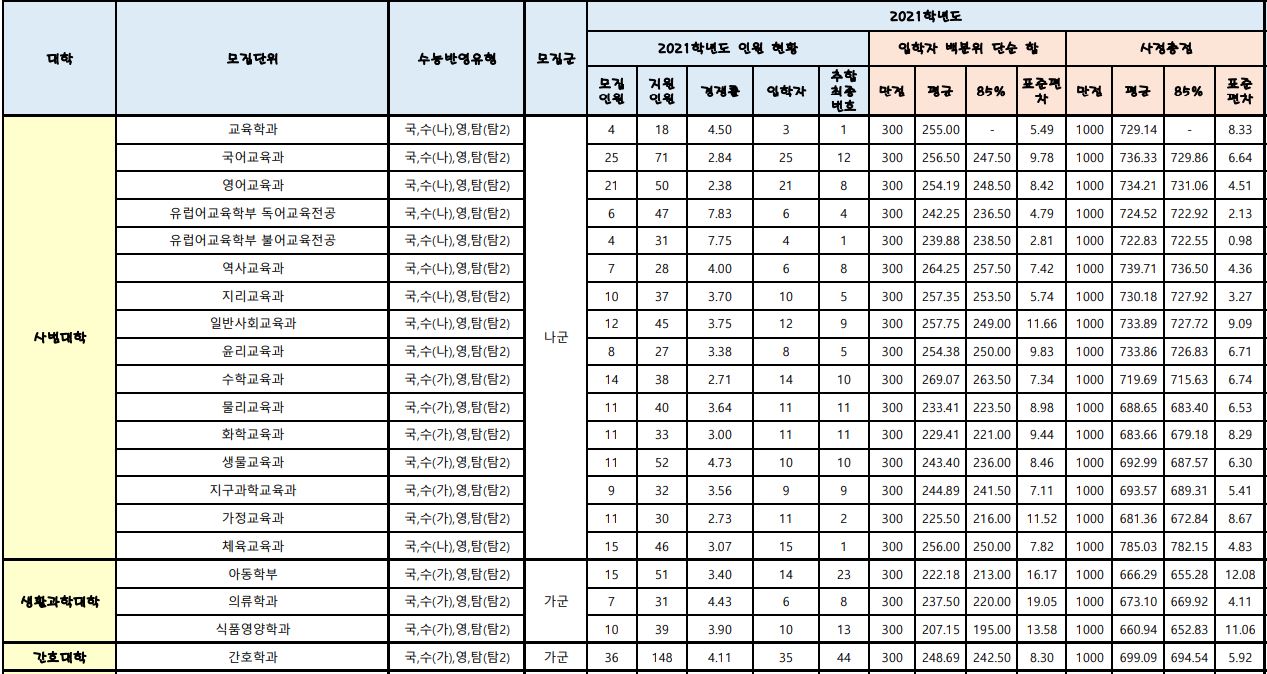 나군 : 정치외교학과, 사학과, 지리학과, 문헌정보학과, 심리학과, 사회복지학부, 미디어커뮤니케이션학과, 신소재공학부, 기계공학부, 건축학부(건축학전공), 건축학부(건축공학전공), 토목공학과, 응용화학과, 화학공학과, 고분자공학과, 섬유시스템공학과, 환경공학과, 에너지공학부, 응용생명과학부, 식품공학부, 산림과학조경학부, 원예과학과, 농업토목생물산업공학부, 바이오섬유소재학과, 식품자원경제학과, 교육학과, 국어교육과, 영어교육과, 유럽어교육학부(독어교육전공), 유럽어교육학부(불어교육전공), 역사교육과, 지리교육과, 일반사회교육과, 윤리교육과, 수학교육과, 물리교육과, 화학교육과, 생물교육과, 지구과학교육과, 가정교육과, 체육교육과, 인문사회자율전공, 자연과학자율전공, 생태환경시스템학부, 곤충생명과학과, 축산학과, 축산생명공학과, 말/특수동물학과, 관광학과, 레저스포츠학과