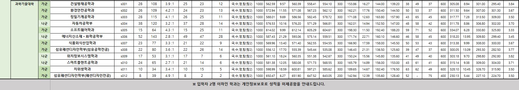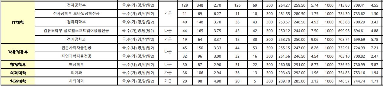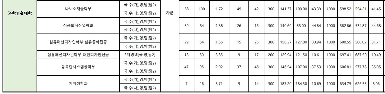 가군 : 국어국문학과, 영어영문학과, 사학과, 철학과, 불어불문학과, 독어독문학과, 중어중문학과, 고고인류학과, 일어일문학과, 한문학과, 노어노문학과, 수학과, 물리학과, 화학과, 생명과학부(생명공학전공), 생명과학부(생물학전공), 통계학과, 지구시스템과학부, 수의예과, 경제통상학부, 경영학부, 아동학부, 의류학과, 식품영양학과, 간호학과, 약학과, 전자공학부, 전자공학부 모바일공학전공, 컴퓨터학부, 컴퓨터학부(글로벌소프트웨어융합전공), 전기공학과, 의예과, 치의예과, 건설방재공학부, 정밀기계공학과, 자동차공학부, 소프트웨어학과, 나노소재공학부, 식품외식산업학과, 섬유패션디자인학부 (섬유공학전공), 융복합시스템공학부, 치위생학과, 섬유패션디자인학부 (패션디자인전공)
