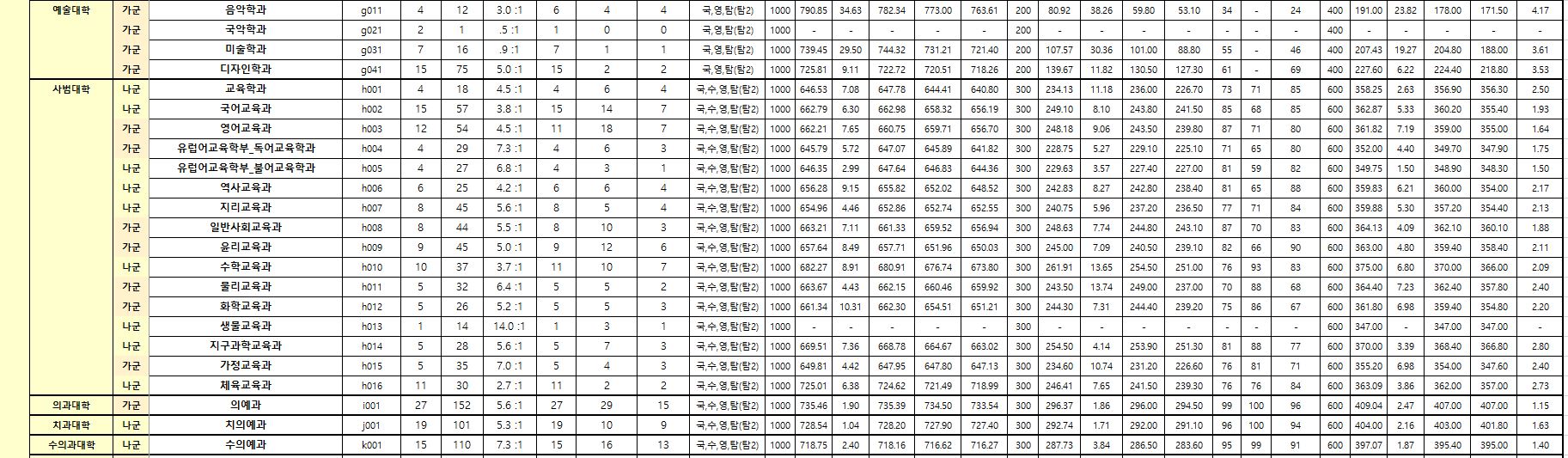 작년 음악학과, 국악학과, 미술학과는 미달이었으며, 경쟁률이 가장 높았던 학과는 생물교육과 (14.0:1), 약학과(12.3:1), 노어노문학과(11.6:1) 순이었습니다.