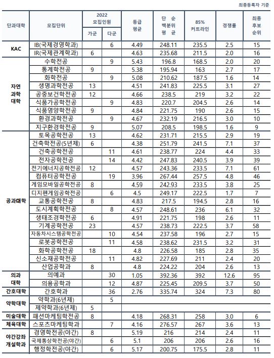 나군 : 자율전공학부 자연계열, 국어국문학전공, 영어영문학과, 중국어중국학과, 러시아중앙아시아학과, 경영학전공, 관광경영학전공, 세무학전공, 경영정보학전공, 정치외교학전공, 언론영상학전공, 문헌정보학과, 사회복지학과, 법학과, 경찰행정학과, IB(국제경영학과), 수학전공, 화학전공, 식품가공학전공, 환경과학전공, 건축공학전공, 전자공학전공, 컴퓨터공학전공, 디지펜게임공학전공, 도시계획학전공, 자동차시스템공학전공, 로봇공학전공, 신소재공학전공, 의예과, 의용공학과, 간호학과, 약학과(6년제), 스포츠마케팅학과, 국제통상학전공(야간), 행정학전공(야간)