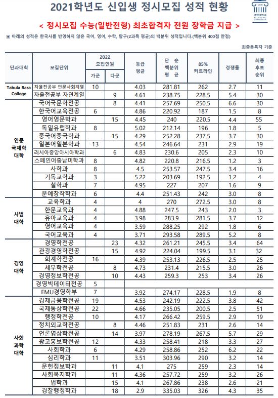 가군 : 자율전공부 인문사회계열, 한국어교육전공, 독일유럽학과, 일본어일본학과, 스페인어중남미학과, 사학과, 기독교학과, 철학과, 문예창작학과, 교육학과, 한국교육과, 유아교육과, 영어교육과, 국어교육과, 회계학전공, 경영빅데이터전공, EMU경영학부, 경제금융학전공, 국제통상학전공, 행정학전공, 광고홍보학전공, 사회학과, 심리학과, IR(국제관계학과), 통계학전공, 생명과학전공, 공중보건학전공, 식품영양학전공, 지구환경학전공, 토목공학전공, 건축학전공(5년제), 전기에너지공학전공, 게임모바일공학전공, 교통공학전공, 생태조경학전공, 기계공학전공, 화학공학전공, 산업공학과, 제약학과(6년제), 패션마케팅학전공, 경영학전공(야간)
