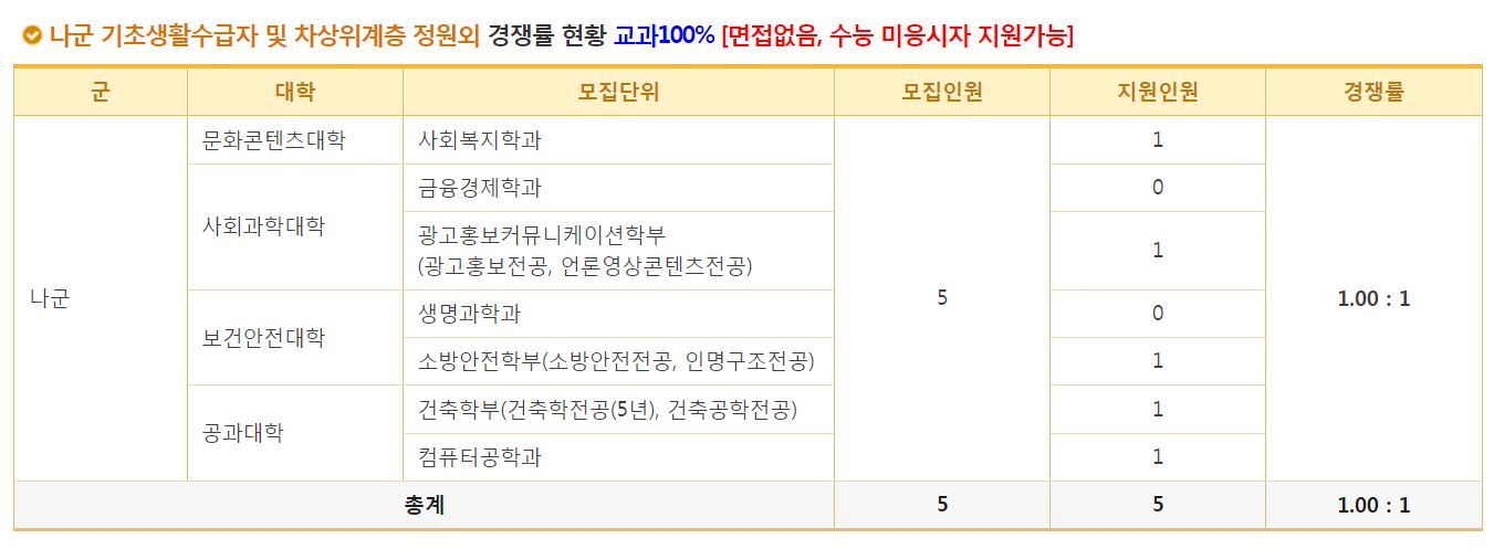 나군 기초생활수급자 및 차상위계층 정원외 전형 역시 학과를 통합하여 학생을 모집했으며, 모집인원과 지원인원이 같았습니다.
