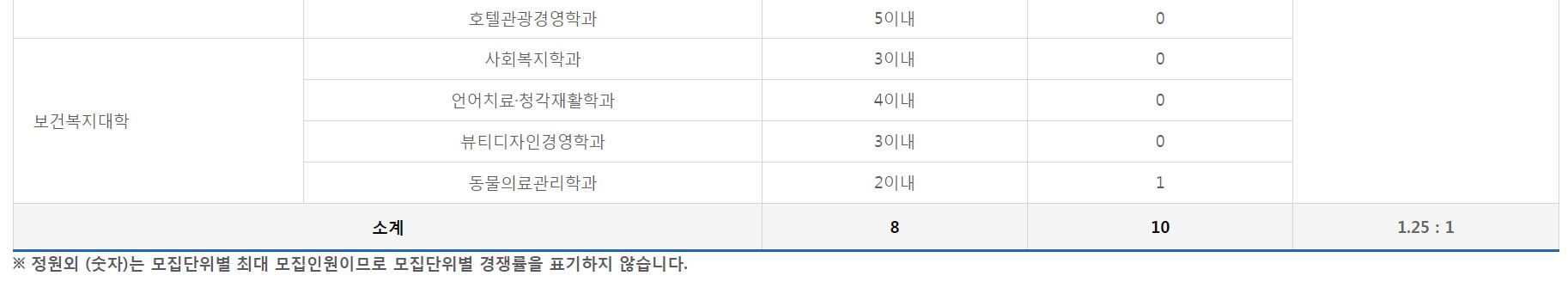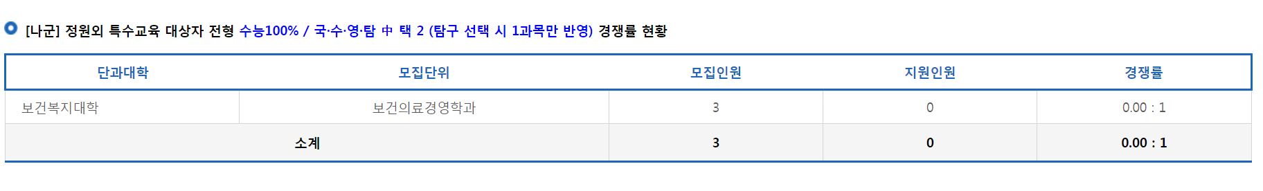 [나군] 정원외 특수교육 대상자 전형에서는 보건의료경영학과의 신입생을 모집했으며, 미달이었습니다.