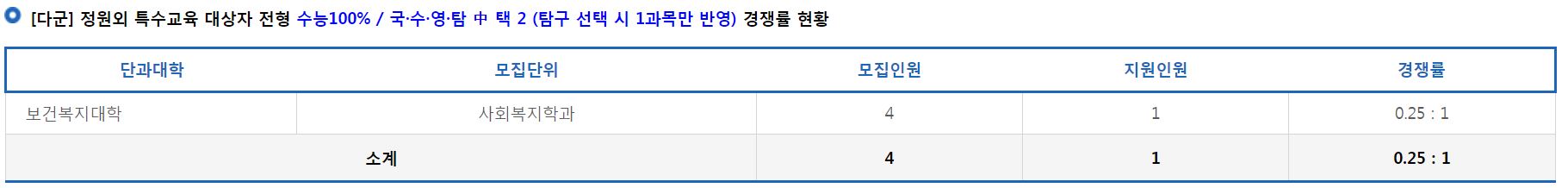 [다군] 정원외 특수교육 대상자 전형에서는 사회복지학과의 신입생을 모집했으며, 미달이었습니다.