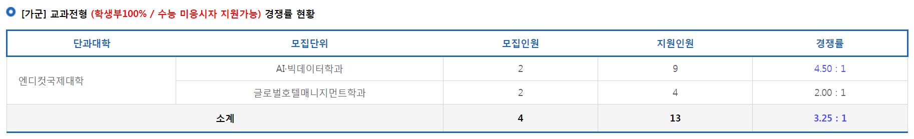 [가군] 교과전형에서는 AI빅데이터학과, 글로벌호텔매니지먼트학과의 신입생을 모집했으며, AI빅데이터학과의 경쟁률은 4.50:1, 글로벌호텔매니지먼트학과의 경쟁률은 2.00:1 이었습니다.