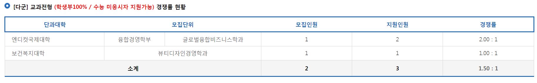 [다군] 교과전형에서는 글로벌융합비즈니스학과, 뷰티디자인경영학과의 신입생을 모집했으며, 뷰티디자인경영학과의 모집인원과 지원인원은 같았으며, 융합경영학부 글로벌융합비즈니스학과의 경쟁률은 2.00:1 이었습니다.
