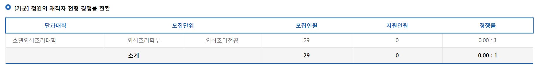 [가군] 정원외 재직자 전형에서는 외식조리학부 외식조리전공의 신입생을 모집했으며, 미달이었습니다.