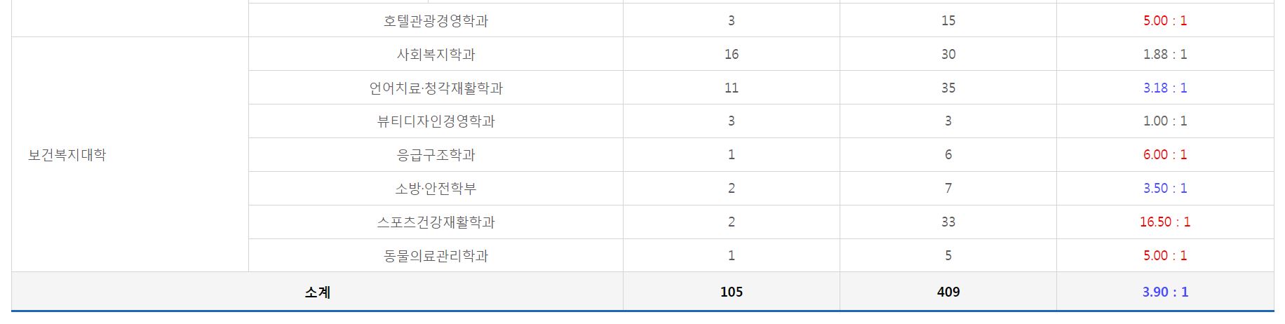 [다군] 일반전형의 뷰티디자인경영학과는 모집인원과 지원인원이 같았으며, 이외의 학과 중 가장 경쟁률이 높았던 학과는 외식조리학부 외식조리경영전공(18.00:1), 스포츠건강재활학과(16.50:1), 글로벌조리학부 Lyfe조리전공(7.50:1) 순이었습니다.