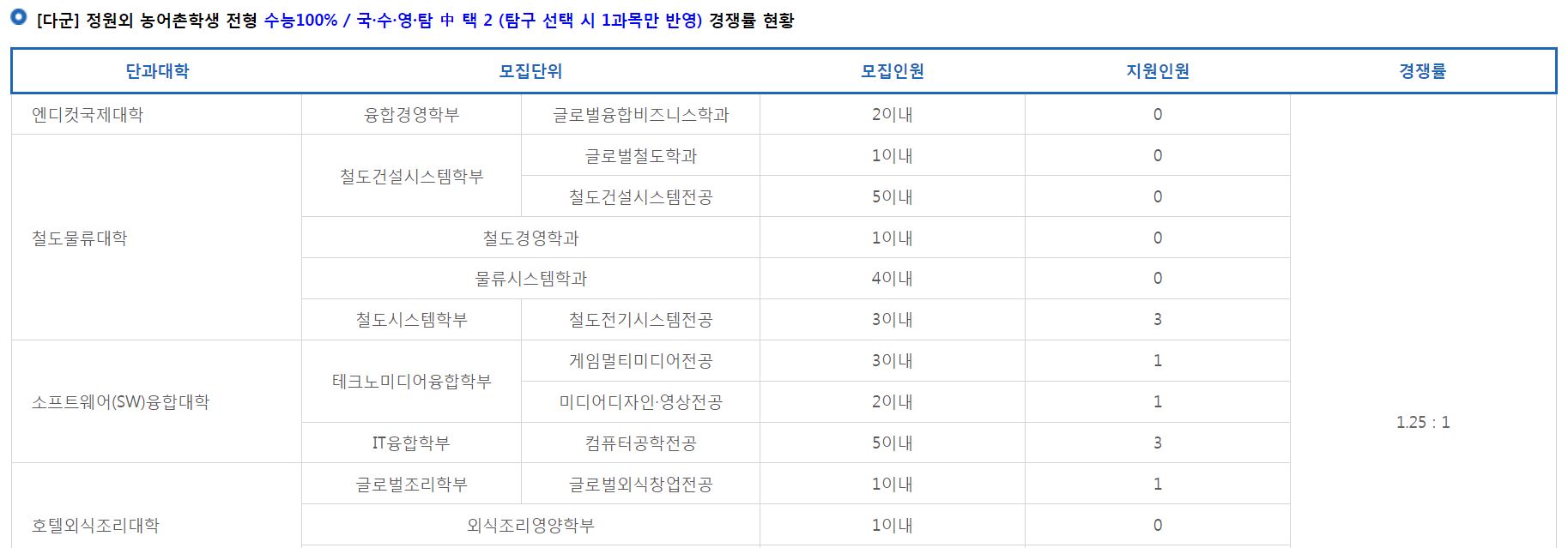 [다군] 정원외 농어촌학생 전형에서는 학과를 통합하여 신입생을 모집했으며, 경쟁률은 1.25:1 이었습니다.