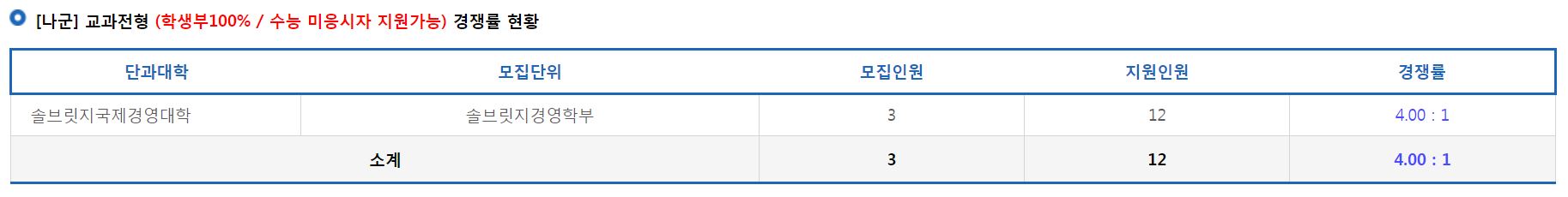 [나군] 교과전형에서는 솔브릿지경영학부의 신입생을 모집했으며, 경쟁률은 4.00:1 이었습니다.