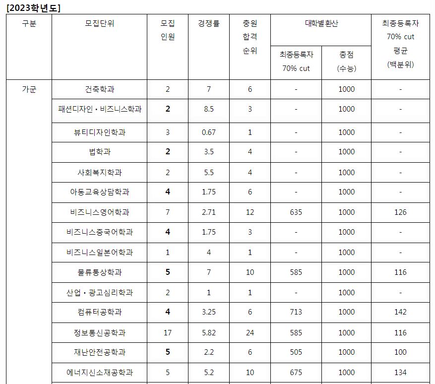 가군 : 건축학과, 패션디자인비즈니스학과, 뷰티디자인학과, 법학과, 사회복지학과, 아동교육상담학과, 비즈니스영어학과, 비즈니스중국어학과, 비즈니스일본어학과, 물류통상학과, 산업광고심리학과, 컴퓨터공학과, 정보통신공학과, 재난안전공학과, 에너지신소재공학과, 간호학과(일반전형), 식품영양학과, 화장품과학과, 정보보안학과, 빅데이터인공지능학과, 핀테크학과, 디지털헬스케어학과, 한의예과(일반전형), 간호학과(지역인재전형), 한의예과(지역인재전형), 군사학과(남), 군사학과(여)