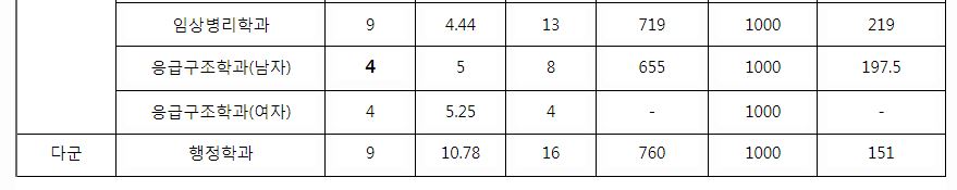 나군 : 경영학과, 회계학과, 건축공학과, 토목환경공학과, 간호학과, 물리치료학과, 임상병리학과, 응급구조학과(남자), 응급구조학과(여자), 보건의료경영학과