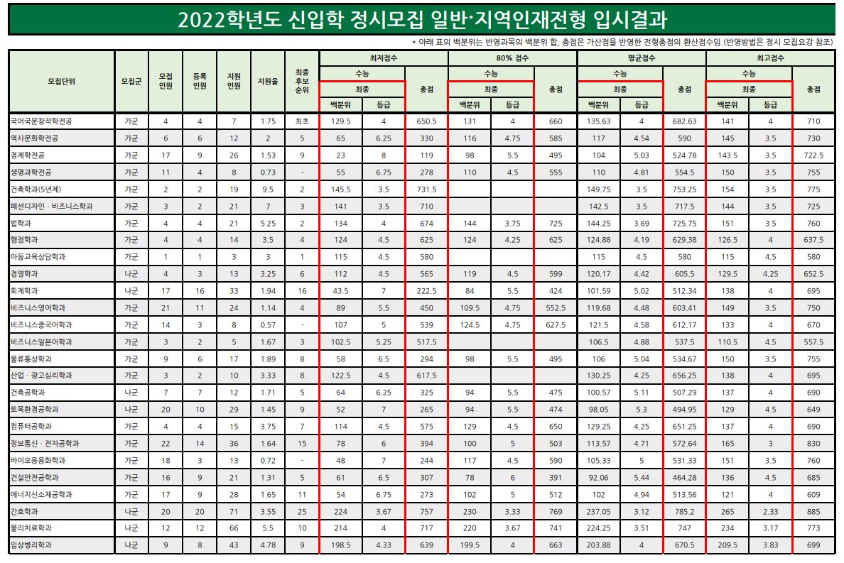 가군 : 국어국문창작학전공, 역사문화학전공, 경제학전공, 생명과학전공, 건축학과(5년제), 패션디자인비즈니스학과, 법학과, 행정학과, 아동교육상담학과, 비즈니스영어학과, 비즈니스중국어학과, 비즈니스일본어학과, 물류통상학과, 산업광고심리학과, 컴퓨터공학과, 정보통신전자공학과, 바이오응용화학과, 건설안전공학과, 에너지신소재공학과, 식품영양학과, 빅데이터학과, 정보보안학과, AI융합학과, 핀테크학과, 디지털헬스케어학과, 한의예과, 한의예과_지역인재, 군사학과(남자), 군사학과(여자)
