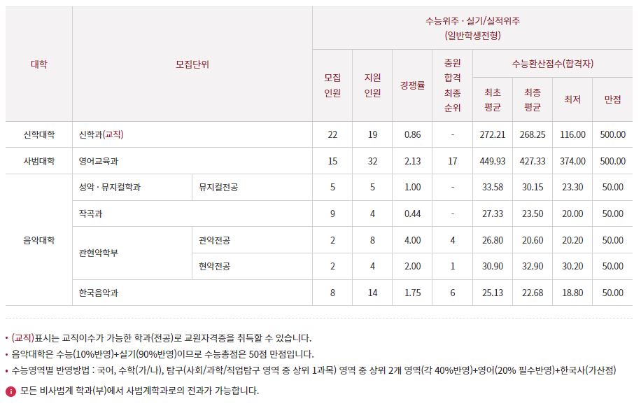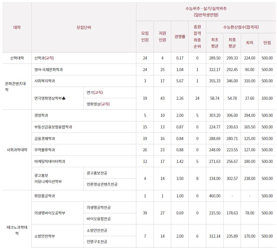 2022학년도 제약공학과, 정보통신공학과, 로봇학과, 관현악작곡학부 현악전공, 관현악작곡학부 작곡전공, 국악과, 신학과, 부동산금융보험융합학과, 금융경제학과, 물류학과, 의생명바이오공학부, 미생물생명공학과, 도시공학과, 전기전자공학과, 성악뮤지컬학부는 미달이었으며, 나머지 학과 중 가장 경쟁률이 높았던 학과는 경찰법학과(5.80:1), 사회복지학과(5.67:1), 미술학부(4.80:1) 순이었습니다.