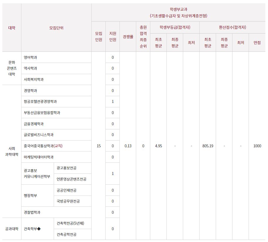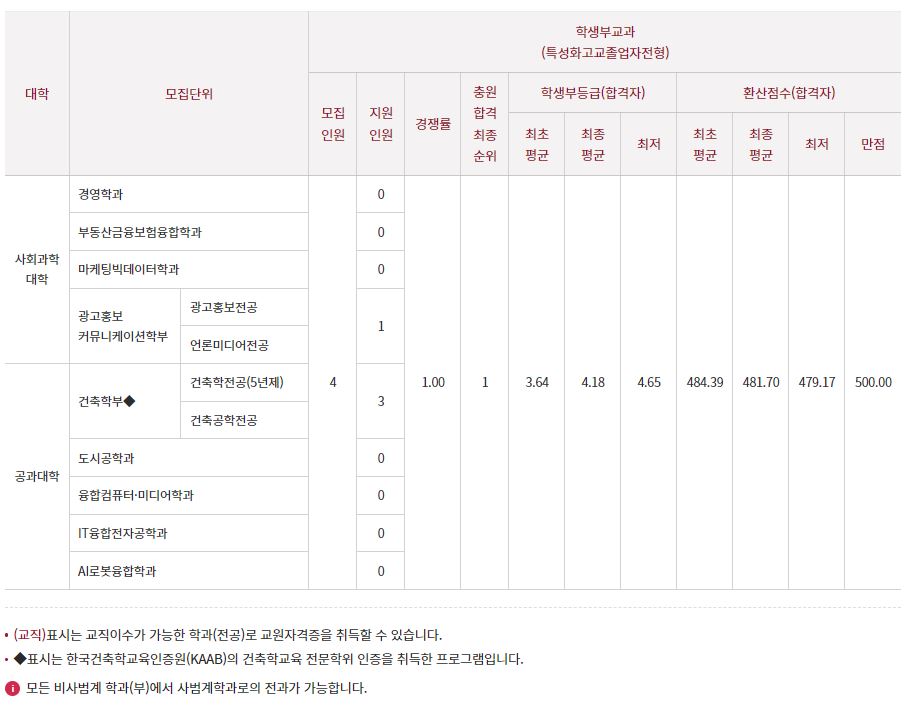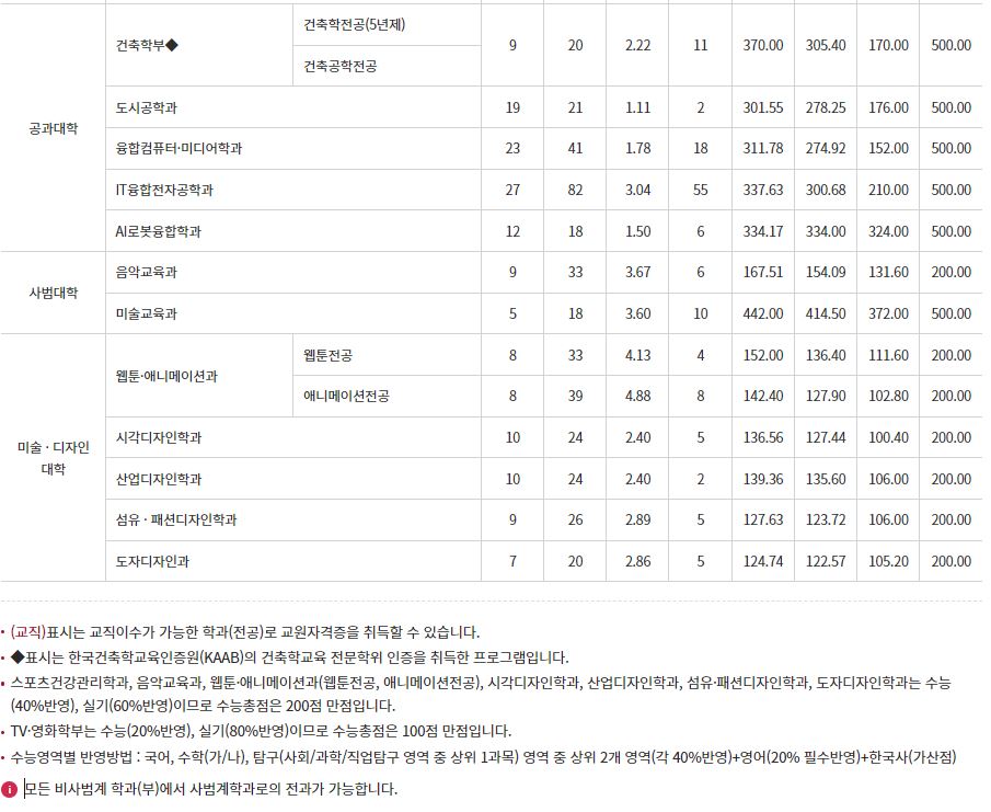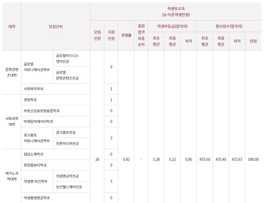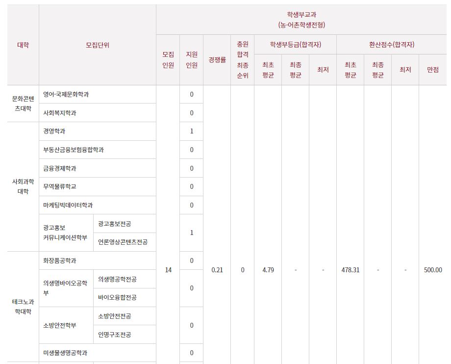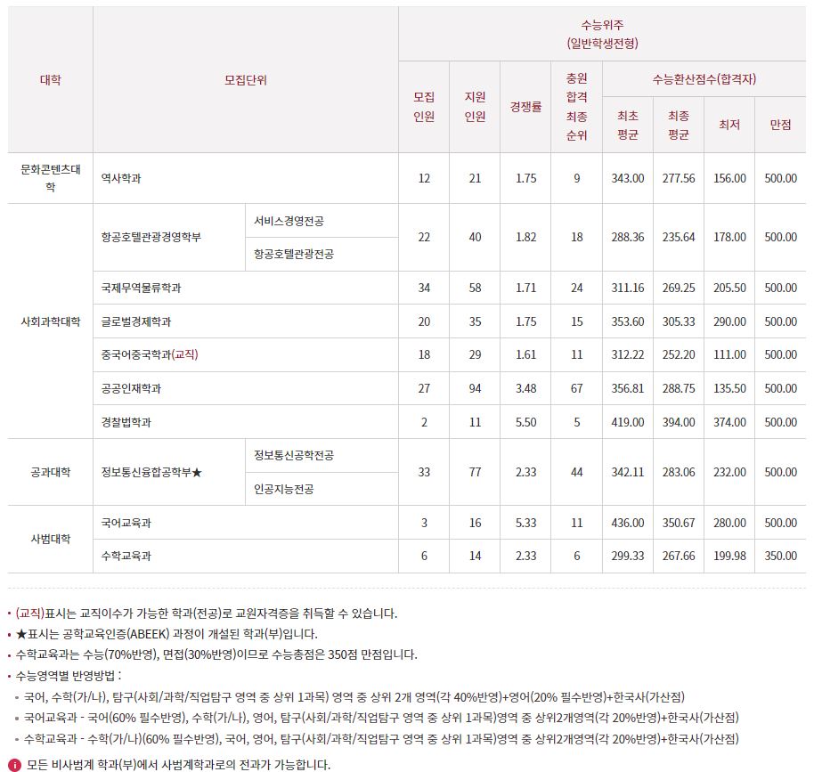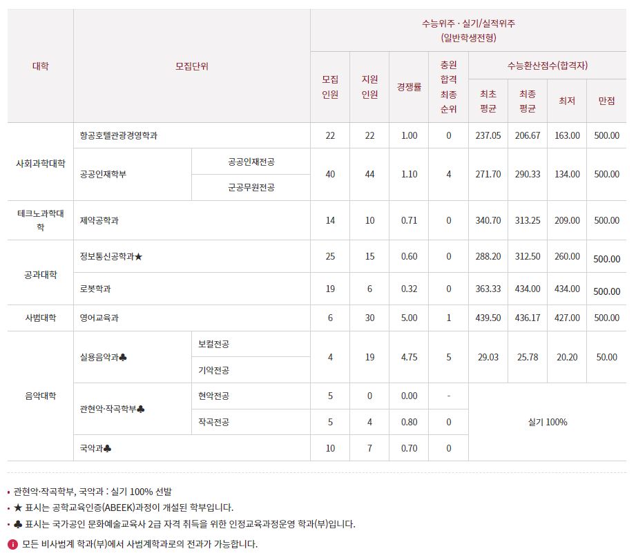 작년 화장품공학과, 신학과, 중국어중국통상학과, 행정학부 국방공무원전공은 미달이었으며 가장 경쟁률이 높았던 학과는 영어교육과(13.00:1), 게임소프트웨어공학과(10.00:1), 건축학부(9.00:1) 순이었습니다.