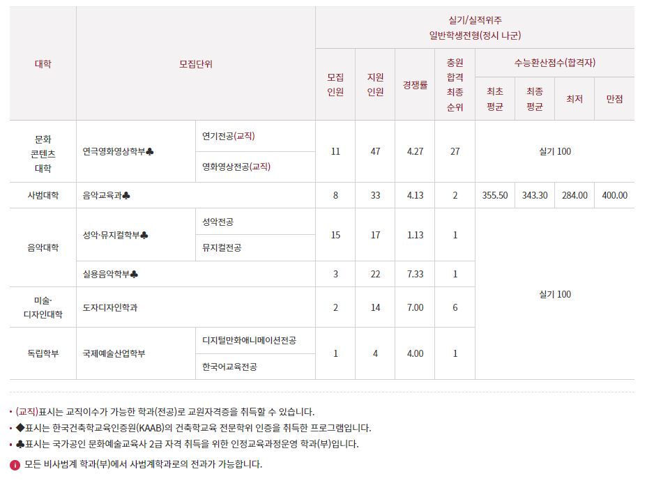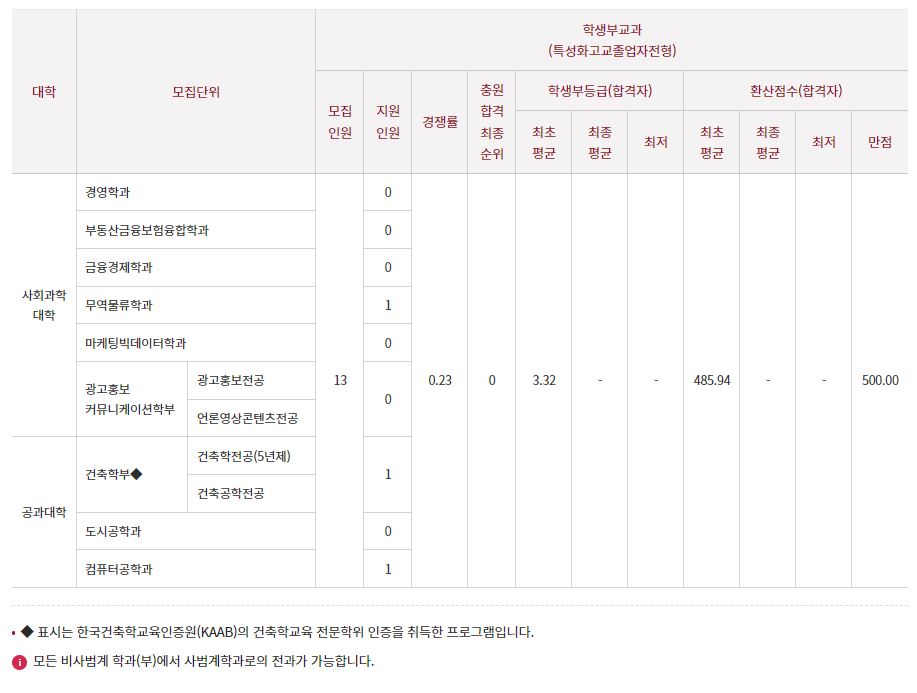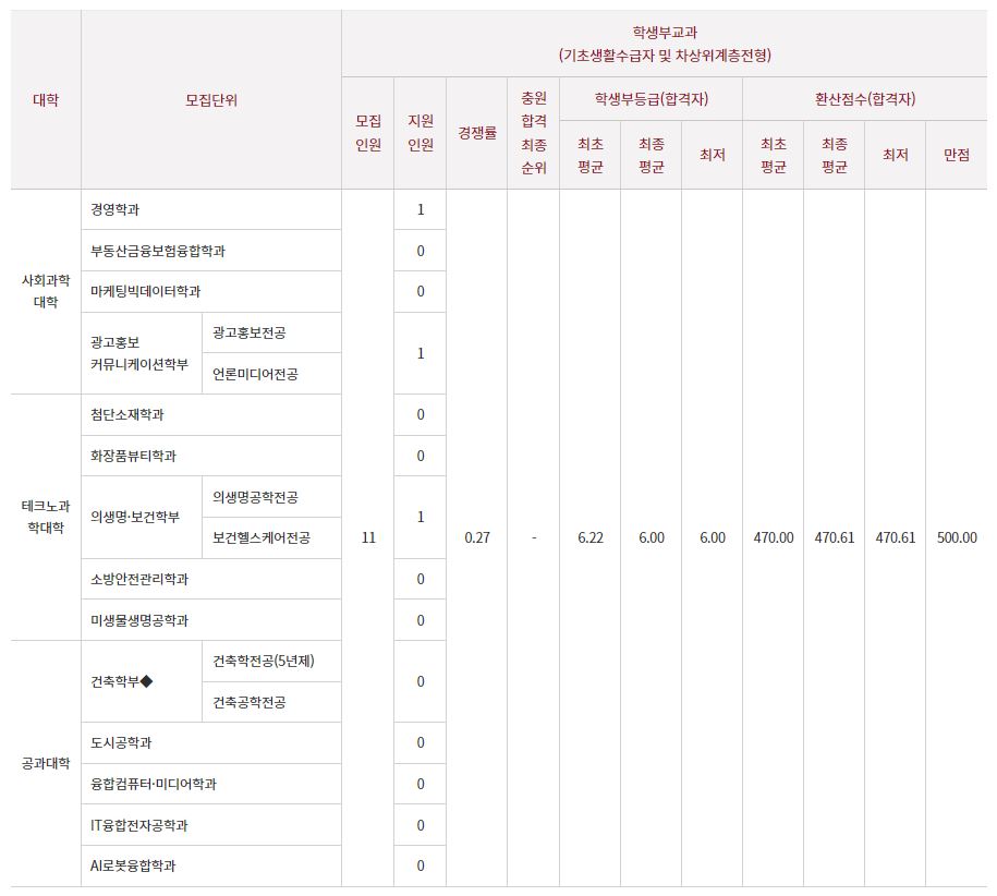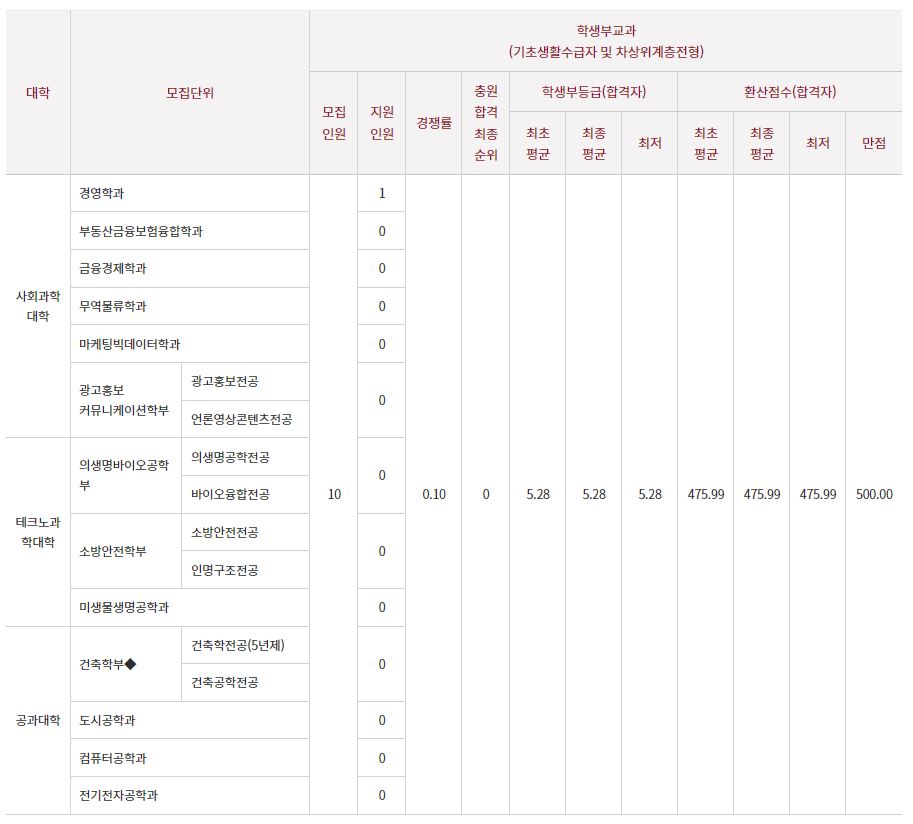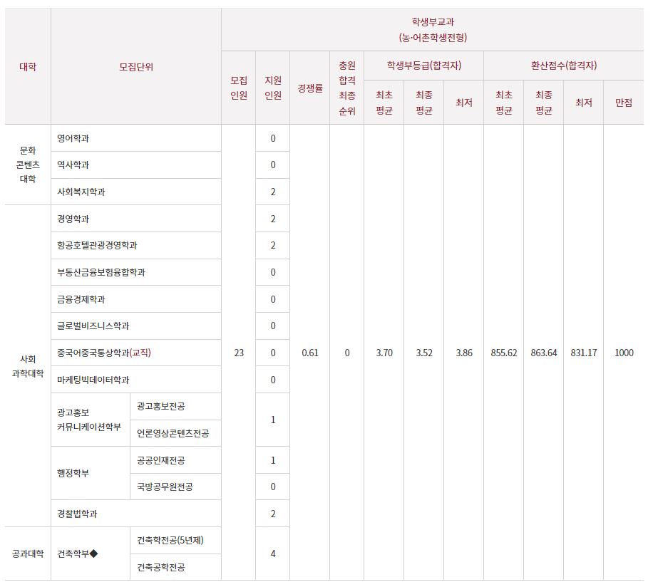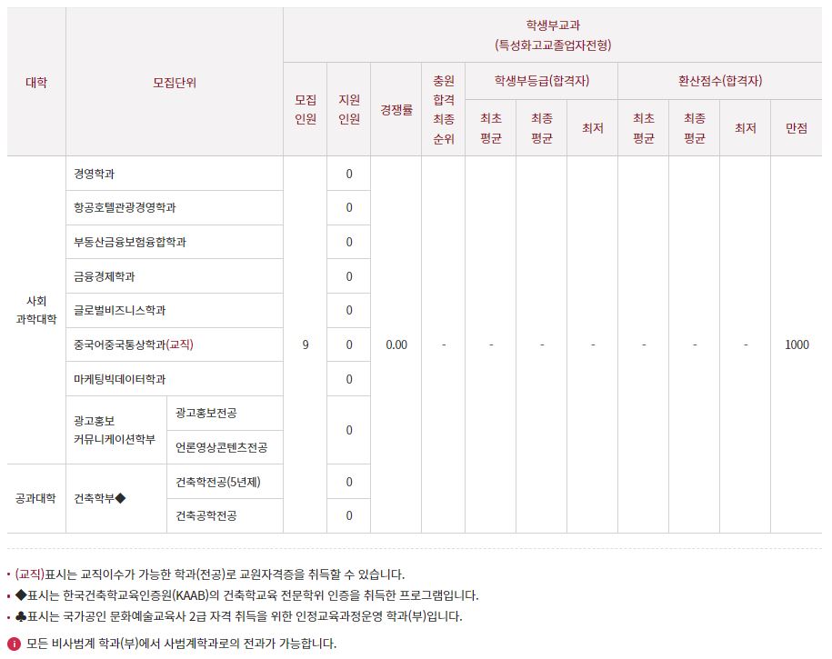 작년 화장품공학과, 신학과, 중국어중국통상학과, 행정학부 국방공무원전공은 미달이었으며 가장 경쟁률이 높았던 학과는 영어교육과(13.00:1), 게임소프트웨어공학과(10.00:1), 건축학부(9.00:1) 순이었습니다.